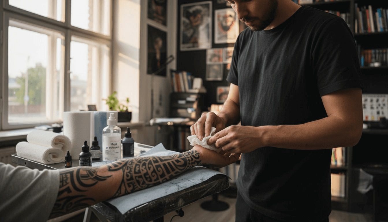Podstawowym etapem jest dokładne oczyszczenie świeżego tatuażu przez tatuatora. Profesjonalista powinien dokładnie przemyć okolice tatuażu środkiem antyseptycznym, delikatnie usuwając wszelkie ślady tuszu oraz pozostałości krwi. Następnie nakłada się specjalną folię ochronną zabezpieczającą świeżą ranę przed czynnikami zewnętrznymi. Folia taka jak second skin chroni tatuaż przed bezpośrednim kontaktem z bakteriami i zanieczyszczeniami.