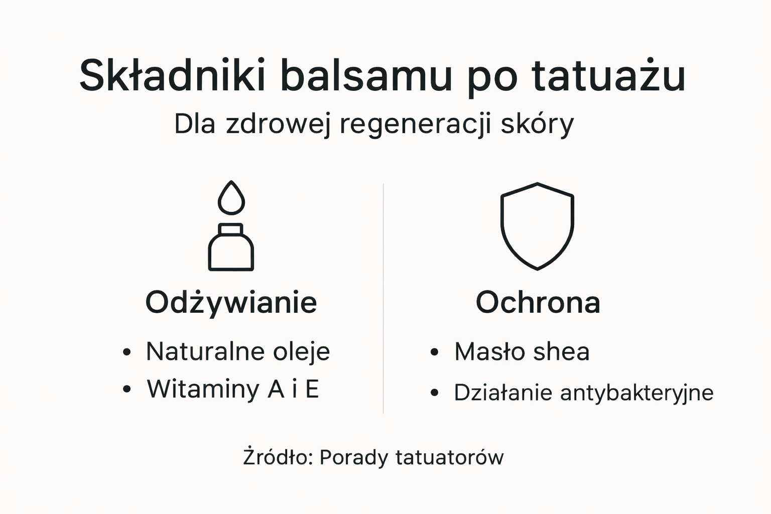 Dobry balsam po tatuażu powinien zawierać naturalne olejki, witaminy A i E, masło shea, substancje antybakteryjne oraz antyoksydanty. Te składniki pomagają w regeneracji skóry i zachowują intensywność pigmentów.